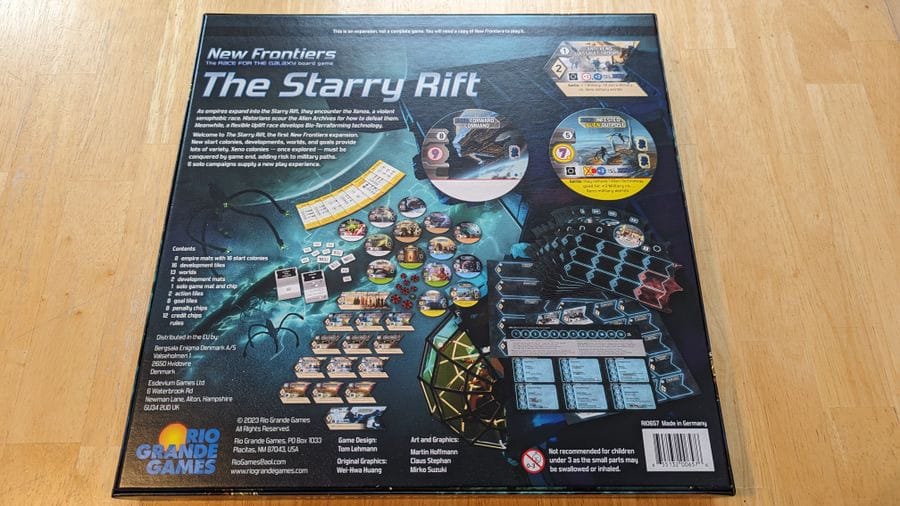 New Frontiers : Starry Rift ajoute 16 mondes d'origine, 10 développements, 13 mondes et 8 objectifs pour développer le jeu de base New Frontiers.