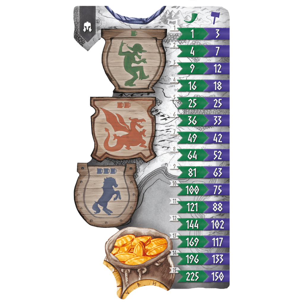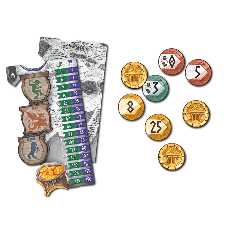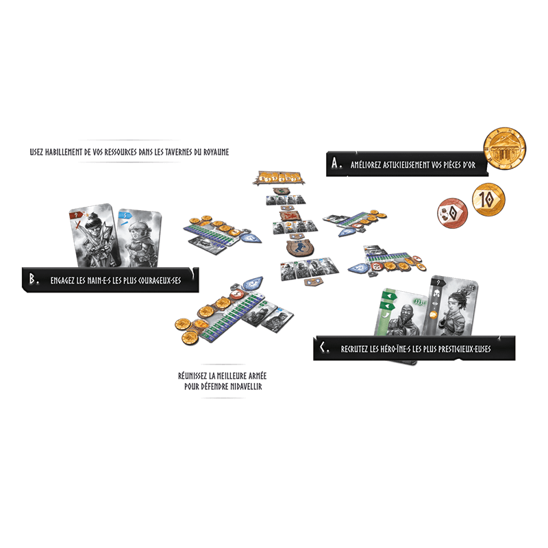 - 87 cartes Nain∙e 5 cartes Distinction 5 cartes Offrande Royale 21 cartes Héros∙ïne 3 enseignes de taverne 5 plateaux individuels Carte du Royaume 3 marqueurs Échange de gemmes 6 gemmes 60 pièces d’or 1 Trésor Royal 4 porte-cartes 1 carnet de score