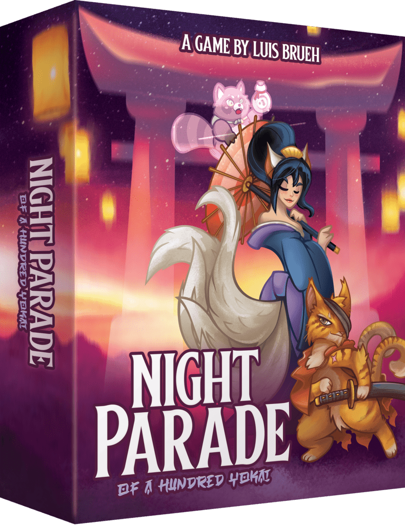 Choisissez parmi 4 factions asymétriques et faites un draft pour invoquer de nouveaux yokai en réalisant la parade nocturne la plus efficace. A chaque tour, activez une de vos parades pour envoyer des meeples hanter les îles, se déplacer et s'affronter. Dès qu'une île a un certain nombre de yokai, les habitants construisent un sanctuaire pour les pacifier, renvoyant vos meeples dans votre zone de jeu. Une fois qu'un joueur a 5 de ses sanctuaires en jeu, les joueurs restants ont droit à un dernier tour, puis le jeu se termine et les points de victoire sont marqués en fonction des cartes cachées pour désigner le vainqueur.