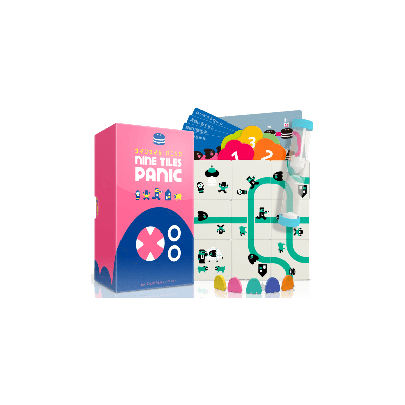 Dans Nine Tiles Panic, chaque joueur a un ensemble de neuf tuiles ville double face. Sur ces tuiles ? en plus des routes vous trouverez des agents, des extra-terrestres, des hamburgers, des chiens, des citoyens, des maisons et des ovnis. Au début d'un tour, trois cartes objectif (parmi 26) sont révélées, et tous les joueurs se lance dans une course pour assembler leur ville (un carré de 3*3 tuiles) selon la disposition qui lui semble le plus avantageuse, en essayant de marquer des points pour une, deux ou trois des cartes objectif. Dès que le premier joueur termine sa ville, il retourne le sablier et tout le monde doit terminer la sienne. Ensuite on attribue les points de chaque carte objectif (le plus d'ET capturés, le plus de virages, avec le plus de chiens etc.) et on recommence une manche si personne n'a atteint le score cible (variable en fonction du nombre de joueurs).