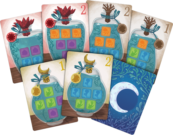 Les joueurs plongent à tour de rôle dans l'eau depuis le bord du rivage pour ramasser les dés de noctiluca du plateau et les garder en sécurité dans des pots jusqu'à ce qu'ils puissent les remettre aux guérisseurs.