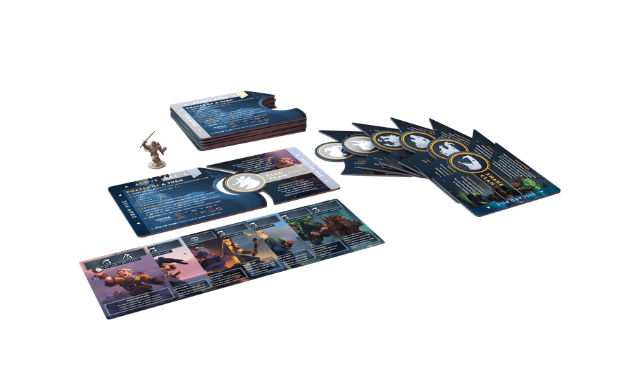- 5 Plateaux de jeu modulaires pour 5 couleurs de joueurs 7 plateaux de jeu modulaires pour 7 clans. 7 cartes d'amélioration du chef suprême (1 carte par clan) 7 figurines de Warchief 1 figurine de Kaija 10 anneaux de couleur en plastique Livre de règles