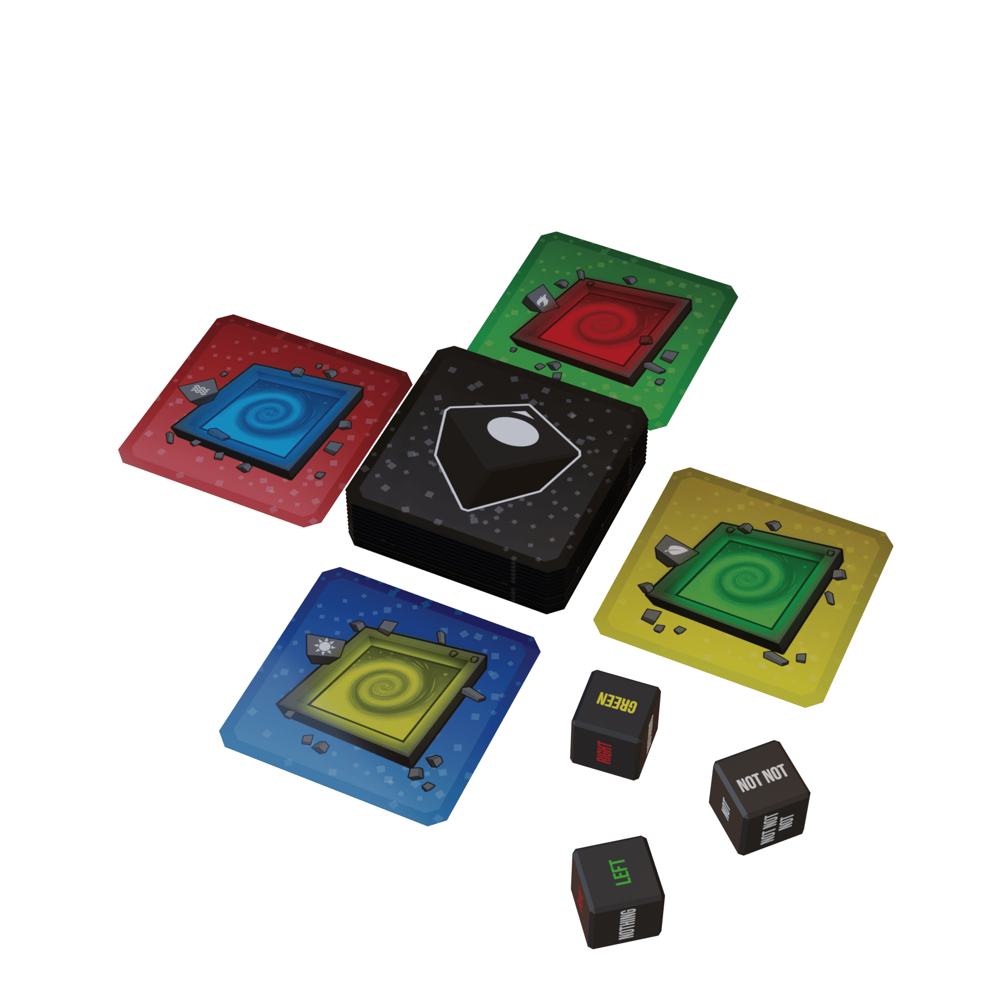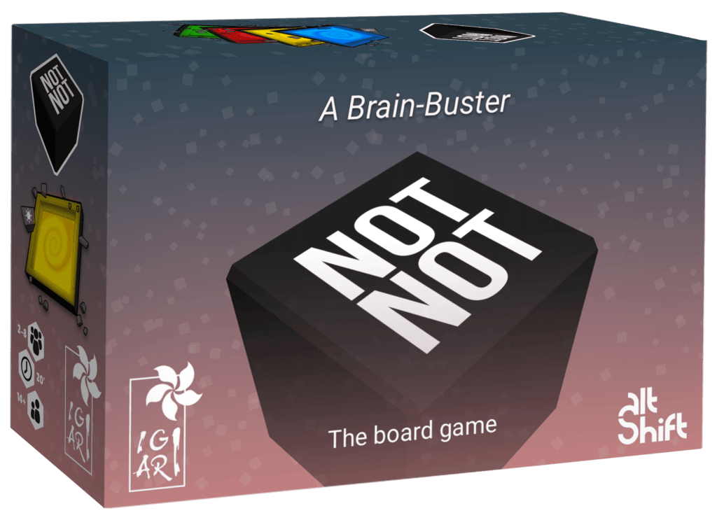 Not Not est l’adaptation multijoueur du jeu vidéo éponyme d’Alt Shift, un jeu de rapidité mêlant orientation, logique et réflexes, basé sur deux biais cognitifs : les multiples négations, ainsi que les mots incongruents (les couleurs sont écrites dans une autre couleur que celle qu’elles désignent).