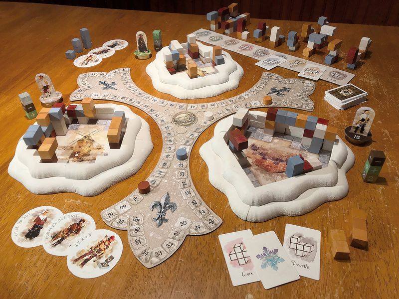 Chaque tour, placez soigneusement un bloc de construction pour aider à construire soit la redoute militaire, soit l'église, soit le moulin seigneurial.