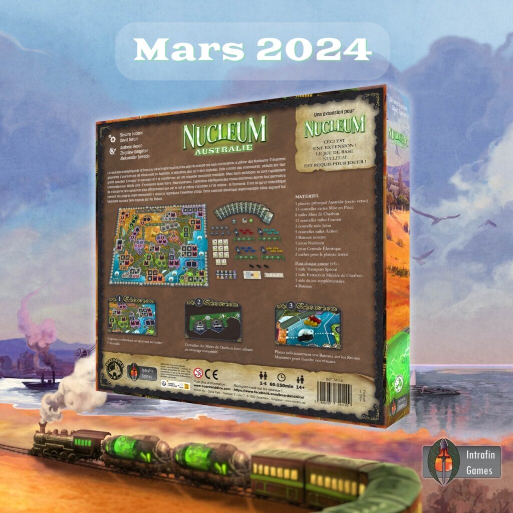 Nucleum : Australia s'accompagne d'une nouvelle carte qui introduit plusieurs nouveaux concepts et changements de règles dans le jeu de base Nucleum. Utilisez les voies maritimes pour étendre vos réseaux, construisez vos propres mines de charbon et essayez la variante expert en faisant des offres pour les expériences.