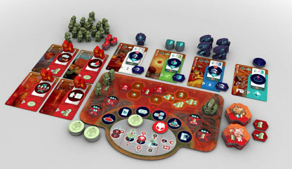 On Mars : Alien Invasion est une extension plus ou moins coopérative pour On Mars. Cette boîte contient 4 chapitres d’une histoire de Nathan Morse, chaque histoire présente une façon différente de jouer au jeu, conçue par Vital Lacerda. Vous jouerez à un contre plusieurs, en totale coopération, et même en solo si vous le souhaitez, selon le chapitre. Vous y trouverez 4 façons originales et totalement rejouables d’établir des colonies sur Mars ! Cette extension de On Mars est divisée en chapitres, chacun d’entre eux étant conçu pour modifier l’expérience de jeu en apportant de nouvelles règles. La différence la plus fondamentale est que la plupart des chapitres sont coopératifs, ce qui signifie que chaque chapitre a un objectif spécifique, et que si cet objectif n’est pas réussi par le groupe, vous perdez tous la partie.