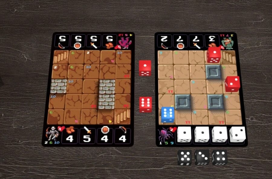 L'aventurier et les monstres sont représentés sur la carte par des dés, la valeur en haut indiquant leur santé actuelle. Chaque pièce a un type de monstre, avec entre 1 et 4 de ce monstre à vaincre dans chaque pièce.