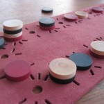 - 1 tapis de cuir avec une « piste » trouée de cases-soleils, au rayonnement « simple », « double » ou « triple » 10 pions blancs 10 rouges 10 noirs 1 bourse en cuir