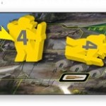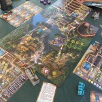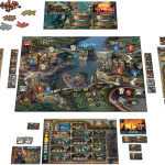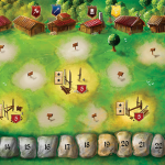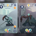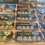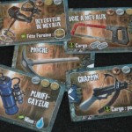 A la phase jour, sur le plateau, chaque joueur dispose de 4 héros (meepples) de force différentes un 5, un 4 et deux 3. Ces valeurs correspondent à leur capacité de récolte. Chacun à leur tour les joueurs vont bouger un de leur Héros de 1 ou 2 lieux de distance et récolter ce qui se trouve sur le lieu d'arrivé (dans la forêt du bois, à l'usine des puces, dans la mine du métal etc...). Un héros de force 3 qui arrive sur un lieu récolte 3 de la ressource (un 5 récolte 5 etc...). Toutefois un héros ne peut pas aller sur un lieu où on a déjà un autre héros à nous. Il faut donc bien gérer l'ordre de ses déplacements en fonction de ses priorités pour le tour. Mais attention, car ce monde est hostile. Les héros de plus forte force qui arrive sur une case où il y a un héros de force inférieur vont mettre la pression (racketter) et donc prendre/voler des ressources à la victime. De plus, les ressources et denrées (et notamment l'eau), sont en quantité limité à chaque tour. Il faut donc bien gérer son timming de déplacement en fonction de la menace des autres, de ses capacités de déplacement et de ses priorités de récoltes car si on arrive "trop tard" sur un lieu, il se peut qu'il n'y ait plus rien pour nous.