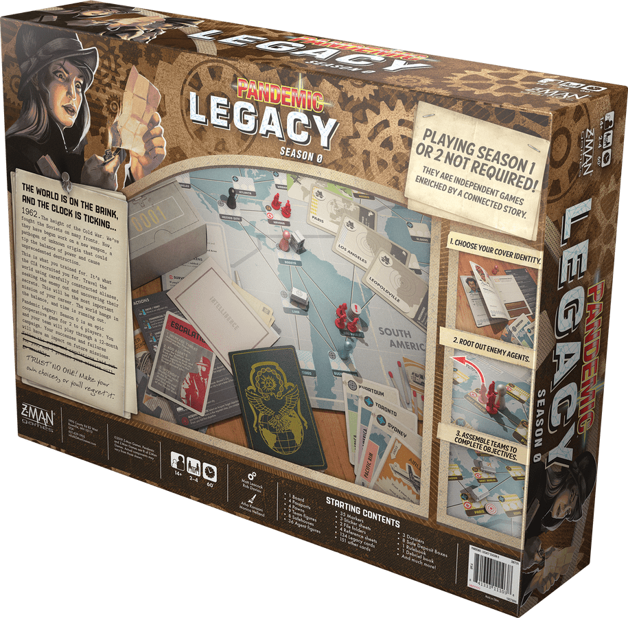 Conçu comme une préquelle, Pandemic Legacy : Saison 0 n'exige pas que vous ayez terminé la saison 1 et la saison 2 avant de plonger dans ce thriller d'espionnage de la Guerre froide. Comme dans les deux premiers jeux de Pandemic Legacy, chaque fois que vous jouez, vous apportez de nouvelles cartes, règles et conditions qui affectent les jeux futurs. Chaque alias que vous créez vous permettra de gagner des contacts et d'autres atouts pour exécuter vos plans plus facilement. Et, bien sûr, la CIA surveillera et évaluera vos performances sur le terrain. Travaillez avec vos collègues agents pour prévenir cette nouvelle menace biologique - le sort du monde en dépend. Pouvez-vous sauver l'humanité une fois de plus ?