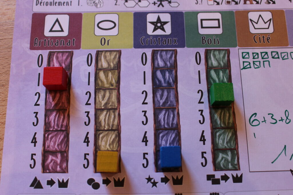 L'exploitation minière de l'or vous donne un revenu pour acheter des cartes qui ont deux options : les bâtiments et les sorts. L'acquisition de bois vous permet de construire ce côté de la carte pour des avantages permanents, tandis que l'extraction de cristaux vous donne le pouvoir d'utiliser la carte pour son sort unique à la place.