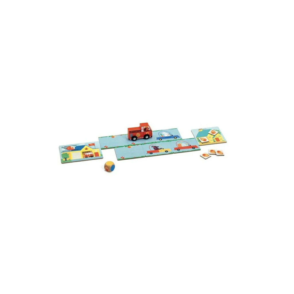 Le jeu contient 12 tuiles "voitures / route libre ", 1 caserne de pompier, 1 maison, 7 jetons "feu", 1 camion de pompier, 1 dé en bois et la règle du jeu.