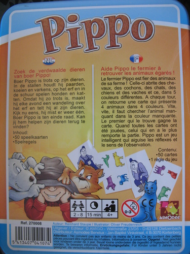 Les animaux du fermier Pippo sont tous uniques : il y a des chevaux, des cochons, des chats, des chiens et des vaches, tous combinés en 5 couleurs différentes. A chaque tour on retourne une carte qui présente 4 animaux dans 4 couleurs. Vite, vite, il faut chercher l'animal manquant dans la bonne couleur. Le premier qui le trouve gagne la carte. Quand toutes les cartes ont été trouvées, celui qui en a le plus a gagné.