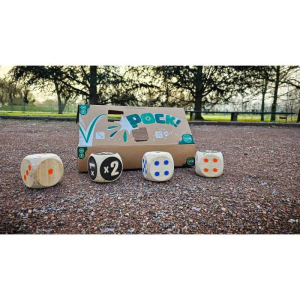 Pock est un jeu de société en extérieur inspiré de la pétanque, avec des dés, jouable de 2 à 8 joueurs, dès 6 ans pour des parties de 30 minutes, édité par Iello.