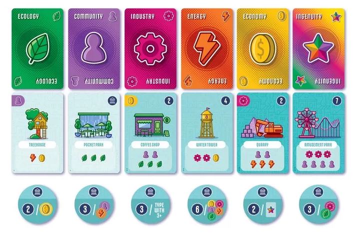 Les règles sont simples : prenez deux cartes adjacentes de la grille dynamique de la ville et ajoutez-les à votre ville en expansion. Utilisez vos cartes de ressources et vos bonus pour construire des cartes de construction qui nécessitent des combinaisons spécifiques. Construisez des structures civiques spéciales pour multiplier les points de votre ville et soyez le meilleur urbaniste !