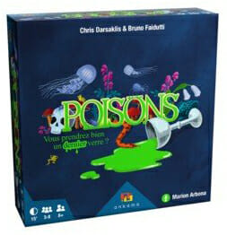 Poisons est un party game mettant les joueurs dans la peau de représentants de poisons à un gala. Tous veulent prouver que leur poison est le plus insidieux et tentent d’empoisonner les autres. Le jeu dure 4 manches. Au début de chaque manche, chaque joueur révèle le nombre de points qu’il va pourvoir marquer ce manche-ci. Chaque joueur possède en main une carte poison et des cartes neutres. Tous les joueurs font passer leur verre dans le sens des aiguilles d’une montre et chaque joueur place une carte sous chaque verre jusqu’à ce que les verres aient fait un tour complet. À cet instant, chaque joueur va devoir décider simultanément s‘il décide de boire pour marquer le maximum de points possibles, ou de ne pas boire car il pense que quelqu’un l’a empoisonné. À la fin des 4 manches, le joueur avec le score le plus élevé gagne.