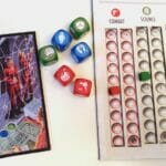 - 75 cartes, 6 dés personnalisés, un plateau de jeu pour 1 joueur et 66 cubes en bois.