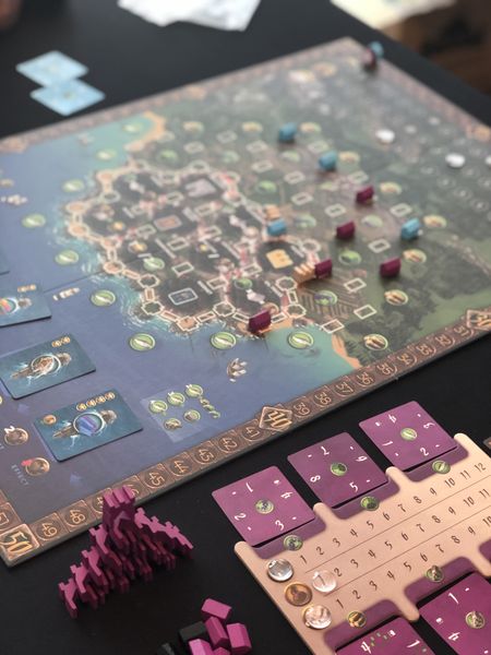 Les joueurs construisent des maisons sur les espaces situés entre trois hexagones, accédant aux ressources (sur les espaces ruraux) et aux actions (en ville), ce qui signifie qu'une maison fonctionne effectivement comme un ouvrier placé, mais déclenche trois lieux à la fois. Les joueurs utilisent les ressources acquises dans les campagnes pour construire des bâtiments, faire du commerce et fabriquer des objets de valeur, dont la valeur varie en fonction des allées et venues des navires dans le port.