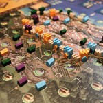Dans la ville, les joueurs ont accès aux actions, chaque spot représentant les trois actions qui l'entourent. Ce simple placement d'ouvrier cède la place à un mécanisme de construction de moteur profond car non seulement la construction autour des espaces de production utilisera les maisons que vous avez déjà construites dans la campagne, mais la construction près des maisons des autres joueurs les réactivera, donnant aux autres joueurs de précieuses opportunités en dehors de leur tour.