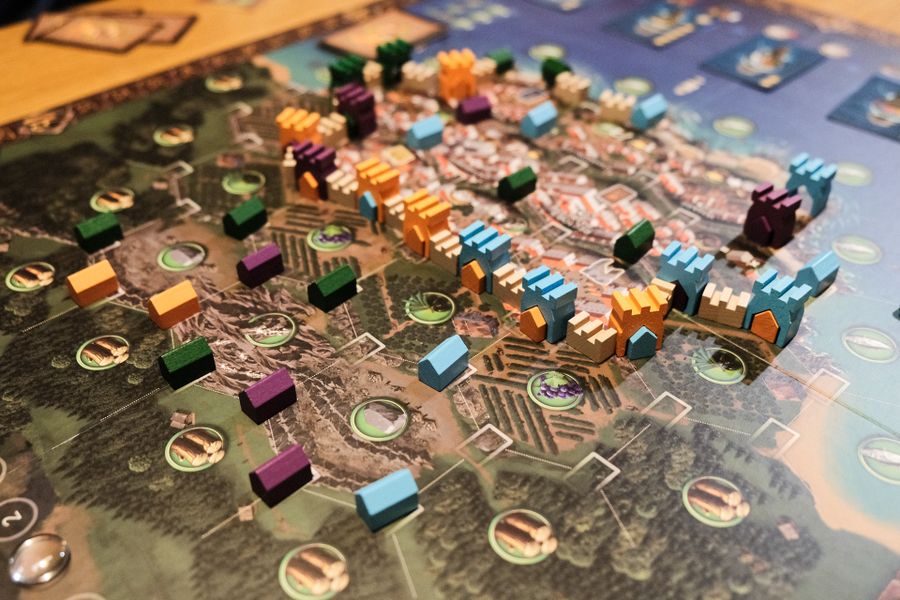 Dans la ville, les joueurs ont accès aux actions, chaque spot représentant les trois actions qui l'entourent. Ce simple placement d'ouvrier cède la place à un mécanisme de construction de moteur profond car non seulement la construction autour des espaces de production utilisera les maisons que vous avez déjà construites dans la campagne, mais la construction près des maisons des autres joueurs les réactivera, donnant aux autres joueurs de précieuses opportunités en dehors de leur tour.