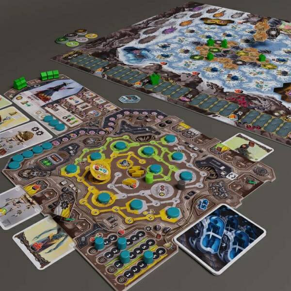 Le plateau de la tribu montre les capacités uniques de votre tribu et les technologies anciennes que vous pouvez réapprendre au cours de la partie. Le plateau de jeu à double couche est l'endroit où vous placez vos machines personnalisées et améliorez vos emplacements de cartes.