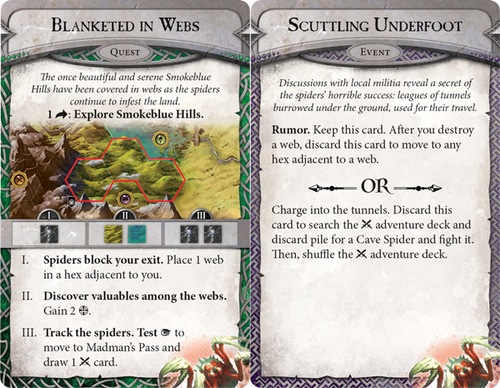Sur le chemin, vous vous trouverez en face de nouveaux monstres hideux ou de périls terrifiants. Vous pouvez rencontrer une Arachyura, une créature proche des araignées qui peut vous piéger dans ses toiles et inflige des dégâts persistants, même après qu'elle est vaincue. Vous pouvez suivre la piste d'un nid d'araignées jusqu'à l'Smokeblue Hills, ou plonger profondément dans les tunnels qui criblent le sol de Terrinoth.