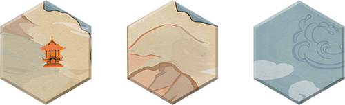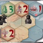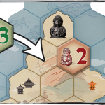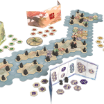 Vous allez poser des tuiles sur un plateau modulable constitué de 4 grands parties (= le Japon). Vos tuiles portent diverses symboles et chiffres, elles symbolisent diverses influences, vous les placez dans l'objectif d'avoir des statuettes en plastique noir, qui sont de 3 types : des casques (nobles), des Bouddhas (prêtres), des rizières (paysans). Le chiffre indique la valeur et le symbole le type de statuette pour lequel elle sera prise en compte. Il y a aussi des tuiles spéciales : 3 navires, 1 ronin et 1 échange de statuettes.