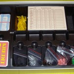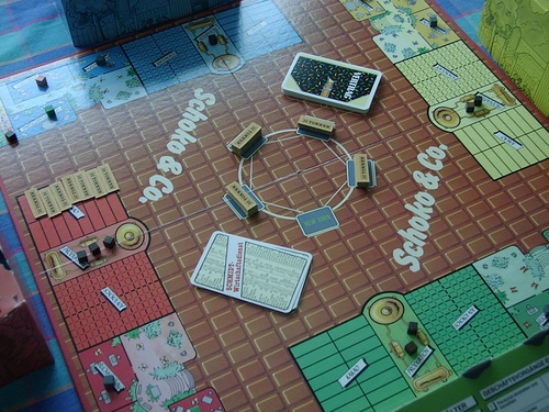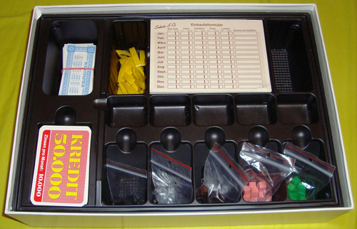 - 1 Plateau de jeu 4 Écrans de caisse 62 Pions de couleur représentant le personnel 4 Pions noirs curseurs 23 Cartes contrats 12 Cartes express 7 Cartes confidentiel 9 Cartes emprunts 1 Bloc de feuilles d'achat 200 Billets de banque 10 Titres de placement 20 Bracelets pour mettre les billets en liasses 100 Barre réversible cacao-chocolat