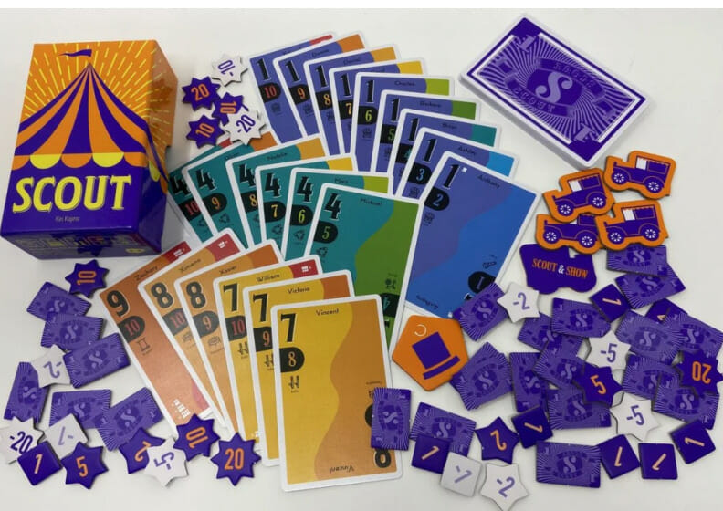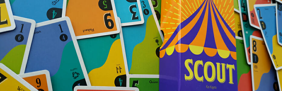Scout, c’est un jeu de cartes, de défausse et de gestion de main, un cousin très proche de Carro Combo. Dans ce jeu de Kei Kajino, vous devrez le plus rapidement possible vous