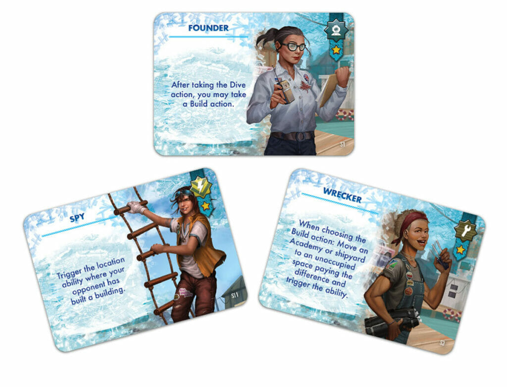 À chaque tour, vous pouvez soit plonger pour gagner des ressources, soit construire un bâtiment à partir de votre tapis de jeu avec vos ressources. Chaque fois que vous plongez, vous tirez une carte avec deux collections de ressources différentes parmi lesquelles vous pouvez choisir, les ressources que vous ne choisissez pas allant à votre adversaire ! Lorsque vous construisez un bâtiment, ajoutez-le à l'une des quatre tuiles de la flottille centrale, ce qui vous permettra d'obtenir des bonus et des capacités - essayez simplement de les utiliser avant votre adversaire !