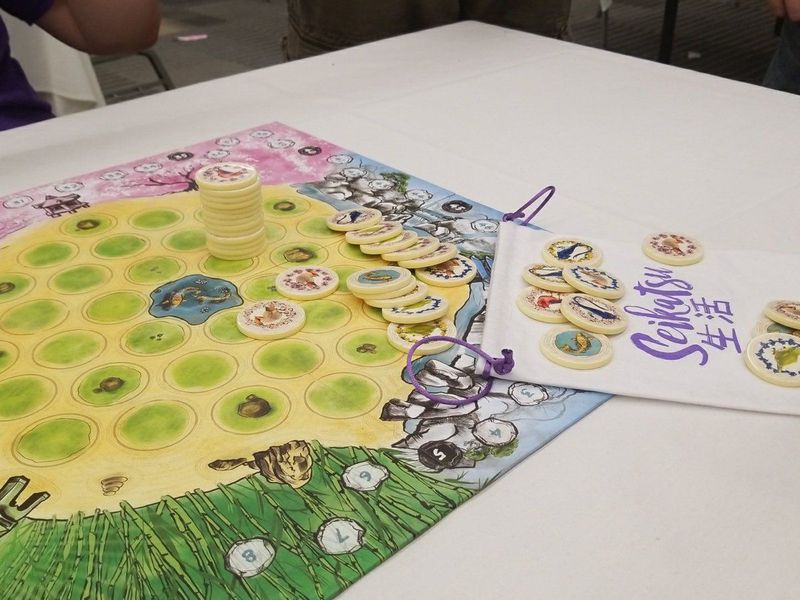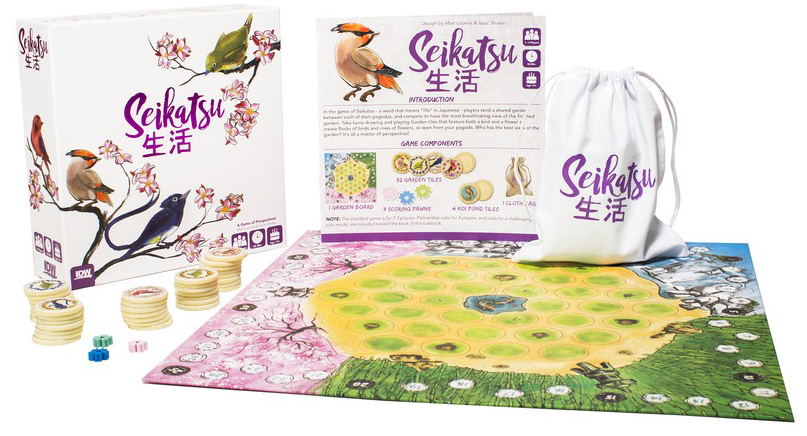 Dans Seikatsu, les joueurs placent à tour de rôle les tuiles dans un jardin commun, chaque tuile montrant une fleur colorée et un oiseau coloré.