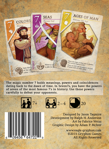 Dans Seven7s vous possédez les pouvoirs des sept des plus célèbres de l'histoire des 7s (les 7 ages de l'homme, les 7 couleurs de l'arc, les 7 péchés capitaux, les 7 vertus, les 7 merveilles, les 7 mers, les 7 dieux chanceux). Utilisez ces pouvoirs soigneusement pour vaincre vos adversaires et avoir le plus de points.