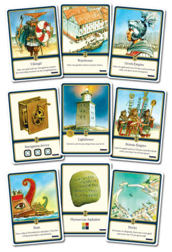 Les navires comprennent 6 types de marchandises : nourriture, pétrole, métaux, vin, tissu et épices. Chacune a une valeur monétaire ainsi que d'un pouvoir spécial. La nourriture peut être utilisée pour prendre le contrôle des lieux, créant ainsi un empire. L'huile peut être utilisée pour obtenir des actions supplémentaires. Le métal aide à avancer vos navires le long de la piste extérieure. Le vin peut être converti en marchandises d'une valeur inférieure. Le tissu peut être converti en points de victoire, tandis que les épices ont une valeur monétaire la plus élevée. Vous devez décider si vous préférez encaisser vos marchandises pour l'argent ou les utiliser pour leur pouvoir.
