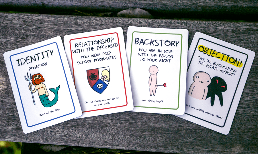 Someone Has Died est un jeu d'improvisation qui se déroule lors d'un arbitrage testamentaire où les joueurs essaient de convaincre un gardien de la succession qu'ils sont les plus dignes de la fortune de quelqu'un. Les cartes d'identité, de relation et d'histoire aident les joueurs à créer des personnages farfelus qui doivent se battre les uns contre les autres pour la richesse et la gloire.
