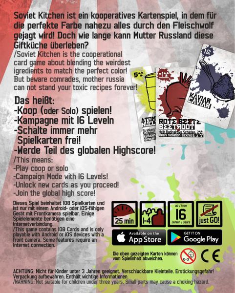Un hachoir à viande basé sur une application est placé sur la table. L'application (pour les appareils Android et iPhone) vous guide à travers l'histoire d'une unité de cuisine sur le terrain dans l'Union soviétique de l'après-guerre. L'application est essentielle pour le jeu de mélange de couleurs! Les camarades discutent des couleurs qu’ils veulent jouer et de leurs effets, mais ils ne se montrent jamais ces cartes. Ensuite, chaque joueur laisse tomber un ingrédient dans le moulin. Les cartes sont numérisées avec la caméra frontale de l'appareil avec chaque action entreprise par les joueurs. Plus de 80 cartes illustrées différentes permettent un nombre infini de mélanges de couleurs et d'occurrences! Si la couleur obtenue est suffisamment proche de la cible, votre repas est accepté et le jeu continue. Plus vous mélangez, plus vous gagnez d'argent en mises à jour de meuleuses pour les prochaines parties.