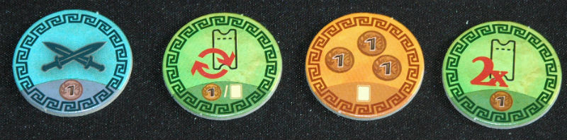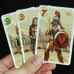 Entrez dans l’arène avec vos gladiateurs. Tentez de gagner vos combats en remportant les plis… ou pas, en fonction des paris que vous avez placé précédement. Vous pouvez prendre jusqu’à 4 paris, mais vous préférerez peut-être choisir d’autres actions. Simple ? Attendez de découvrir la profondeur tactique de Sponsio : trouvez les meilleurs combinaisons pour établir le meilleur score !