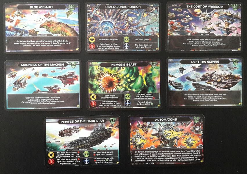 En compétitif : Chaque carte défi représente un ennemi avec des instructions de configuration uniques, des règles-exceptions, des capacités spéciales et sa propre séquence de jeu.