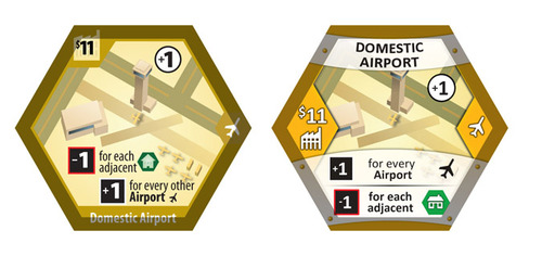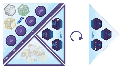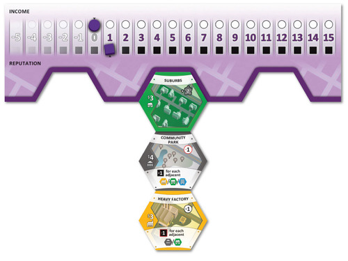 Les tuiles hexagonales arrivent une à une sur le marché. Plus vous prenez le risque d’attendre avant de les acheter, moins elles couteront cher (de 10$ à 0). Une tuile achetée doit être posée à côté de celles que vous avez déjà placées devant vous. Il faut procéder précautionneusement car les tuiles interagissent entre elles. Un parc fait par exemple grimper d’1 votre réputation par tuile qu’il touche ; un parking et un immeuble qui se touchent font grimper vos revenus…