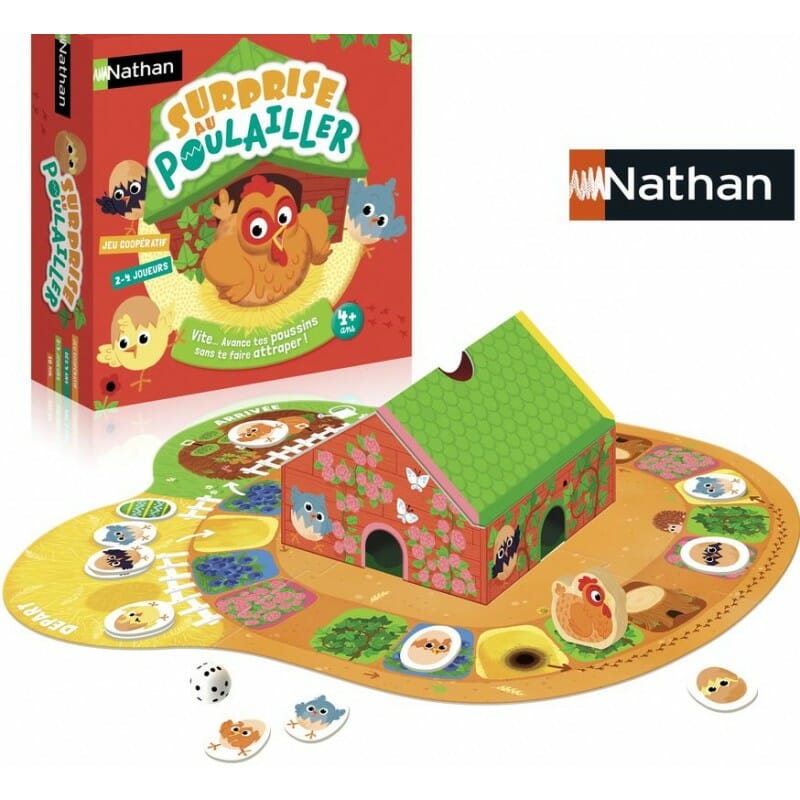 - 1 poulailler à assembler avec thermoformage intérieur, 1 plateau de jeu (36 x 44 cm - composé de 4 grands morceaux de puzzle, 1 dé rond (constellation 1 à 6) , 16 jetons poussins et 4 jetons « œuf en chocolat », 1 Maman Poule en bois (4,5 x 4,5 cm), règle.