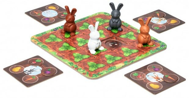 Des lapins coquins s’aventurent dans le potager pour y faire leurs provisions de légumes. Mais pour pouvoir en récolter quatre différents, encore devront-ils mémoriser où ils se trouvent ! Et éviter de se les faire voler par les rats… Le premier lapin qui termine sa récolte complète gagne la partie.
