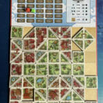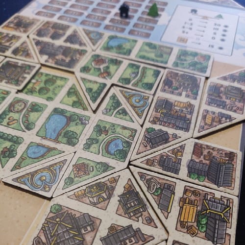 Dans Tangram City, les joueurs placent des tuiles dans un ordre aléatoire sur un terrain carré tout en essayant d'équilibrer le nombre de tuiles ville (rouges) et parc (vertes). Plus les tuiles sont équilibrées et plus vous construisez souvent un rectangle, plus les joueurs reçoivent de points bonus.