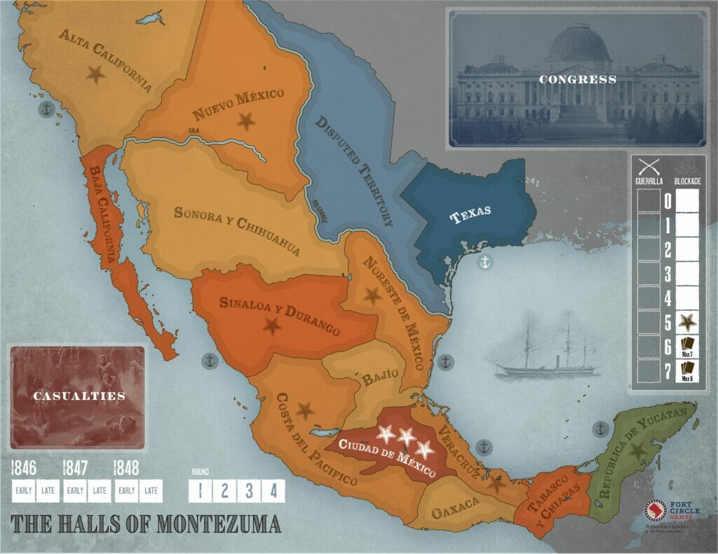 Dans The Halls of Montezuma, deux joueurs doivent recréer cette guerre cruciale de l'histoire américaine et mexicaine. Dans le rôle des États-Unis, vous devrez vous emparer de la Californie et envahir le Mexique tout en faisant face à une opposition politique croissante dans votre pays. En tant que Mexicain, vous serez contraint de mener une guerre d'usure défensive contre les troupes américaines, mieux entraînées et mieux dirigées.