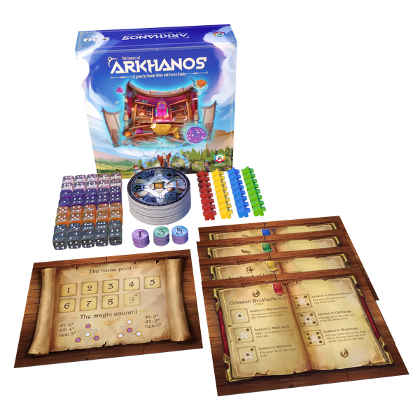Dans Les Tours d'Arkhanos, les joueurs doivent construire conjointement des tours obscures pour canaliser le pouvoir des civilisations passées. Pour cela, votre maître et vos apprentis doivent utiliser des pierres magiques (dés) et appliquer les capacités écrites dans le livre de magie, acquérant du prestige et devenant le magicien avec une réputation incroyable dans le royaume.