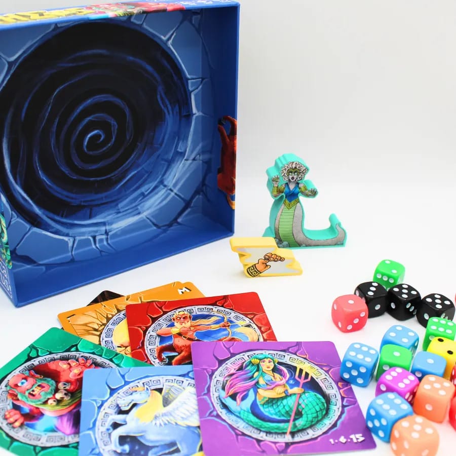 Dans Theos, vous incarnez une divinité grecque qui souhaite capturer des créatures mythologiques ! Visez bien et lancez vos dés avec la bonne force pour remporter les meilleures cartes ou voler celles de vos adversaires. Si vous marquez plus de points que les autres, vous régnerez sur tout l'Olympe !