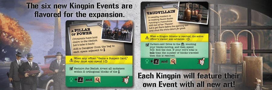 Dans l'extension Kingpins, l'un des six Kingpins a pris le contrôle de la ville. Vous devez rassembler vos esprits et les abattre, en ajoutant un temps précieux qui vous empêchera d'élucider le meurtre. L'identité du Kingpin sera révélée au fil du jeu.
