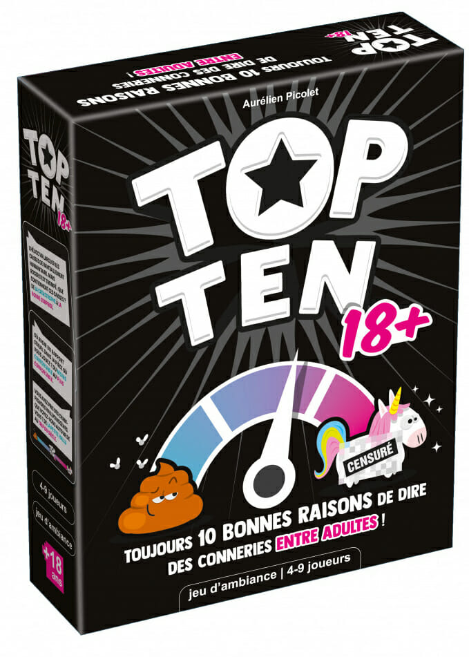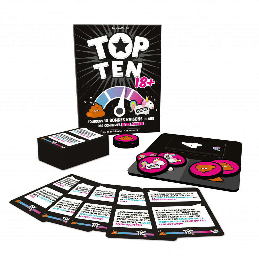 Top Ten 18+ est un jeu coopératif innovant et drôle pour adultes, comprenant 500 thèmes variés et délirants qui vous feront inventer, raconter et mimer n’importe quoi !