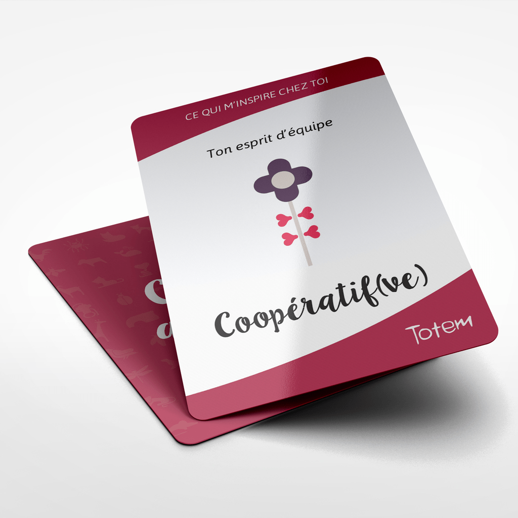 donneur remet un Totem (carte Animal + carte Qualité) au couple receveur; On recommence jusqu’à ce que tous les couples aient été receveurs; Chacun des couples se crée un Totem à partir de toutes les cartes Animal et Qualité reçues; À tour de rôle, les couples présentent et expliquent le Totem choisi.