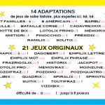 35 jeux dont 21 originaux et 14 adaptations inspirées de grands classiques connus comme la bataille, le 8 americain, le mémory, le barbu...