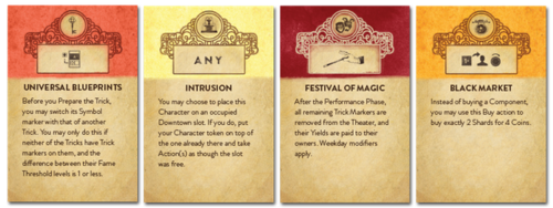 User du placement d'ouvriers ( l'ingénieur, la Jolie assistante, le directeur, et une poignée d'apprentis ) & des actions simultanées pour vous procurez des plans et des composants pour vos tours de magie afin de monter les meilleurs tours possibles, agrandir votre équipe et monter des shows dans les théâtres de la cité.