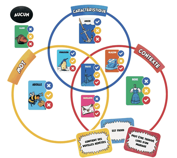 Le but du jeu est de se débarrasser de toutes ses cartes. Pouvez-vous comprendre la logique des anneaux avant vos adversaires ? N'oubliez pas que vous pouvez jouer dans les zones de chevauchement du diagramme de Venn, ou même en dehors !
